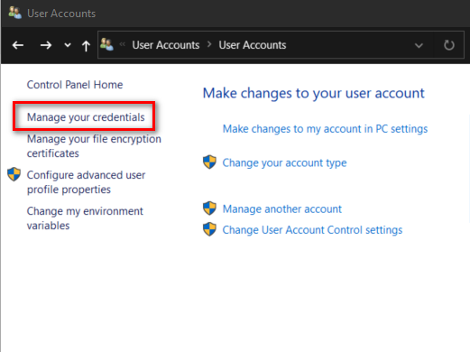 Accessing the User Accounts menu - Once you’re inside the User Accounts menu, look on the left-hand section and click on Manage your credentials from the list of vertical options.