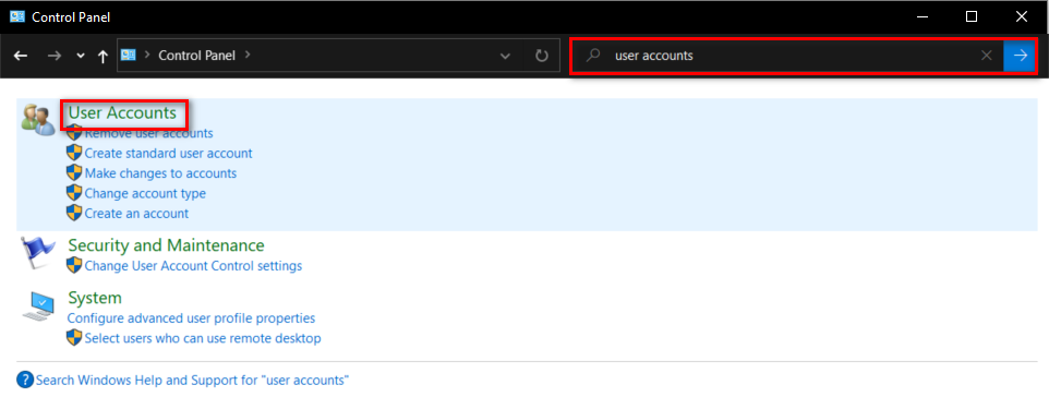 Running the Control Panel - Once you’re inside the classic Control Panel interface, use the search function in the top-right corner to search for ‘User Accounts‘. Then, from the list of results, click on User accounts (left-hand section).