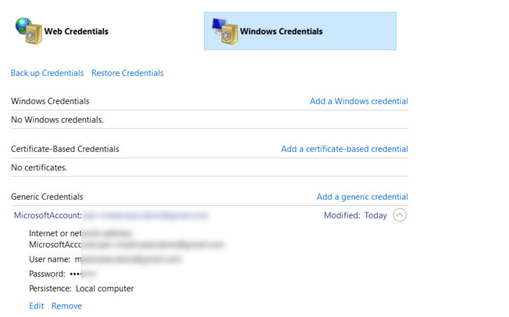 Manage your stored Windows credentials - Once you’re inside Credential Manager, select Windows Credentials from the menu on the right. Then, look down below and click on the entry that starts with MicrosoftAccount. Next, from the expanded drop-down menu, click on Remove and then confirm to globally remove the Microsoft account credential integration.