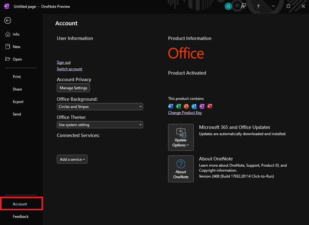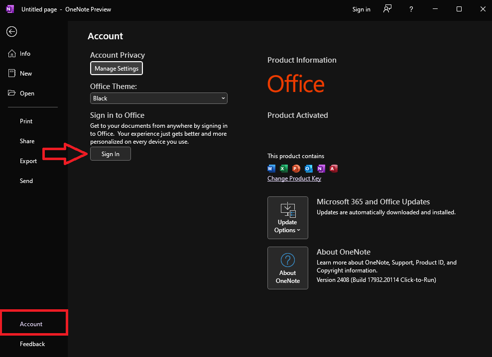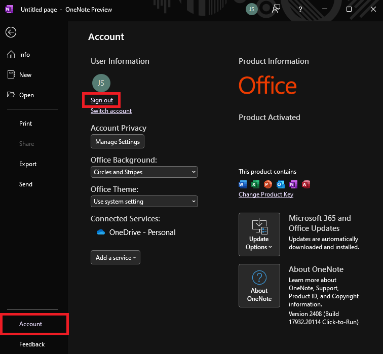 Note: Signing out of the OneNote application will also log you out of all other Microsoft Office applications. Ensure saving any ongoing work prior to signing out.