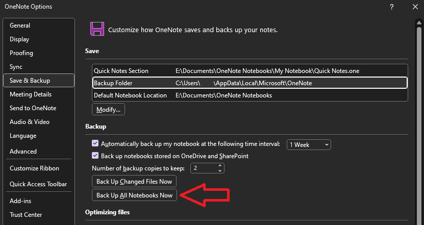 - Navigate to Save and Backup from the sidebar in the OneNote options window, and select Backup All Notebooks Now. (The backup directory is mentioned in the save section in front of the backup folder.)