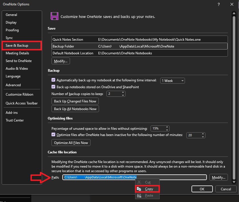 - After the backup process is complete, in the Save & Backup section, find the cache file location and copy the path. After that, close the OneNote application from the notification tray so that it doesn’t run in the background.
