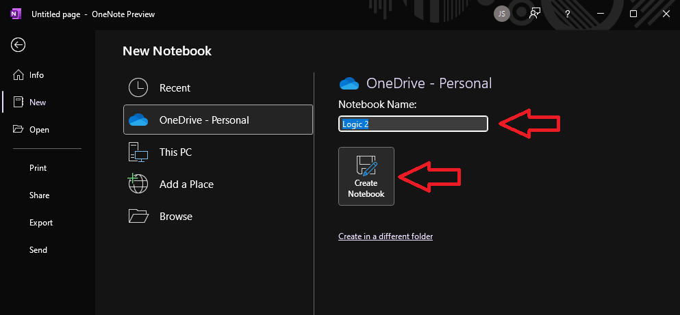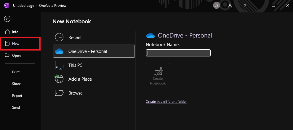 - In the OneNote application, navigate to File>New to create a new notebook.