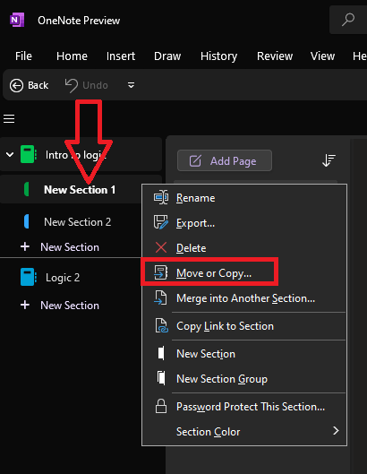 - After creating the new notebook, right-click on the section you want to move from the old notebook and select Move or Copy.