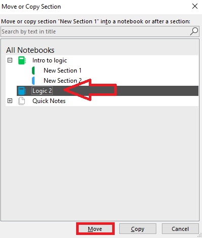 - Select the new notebook and click on the Move button to move the section to the new notebook.
