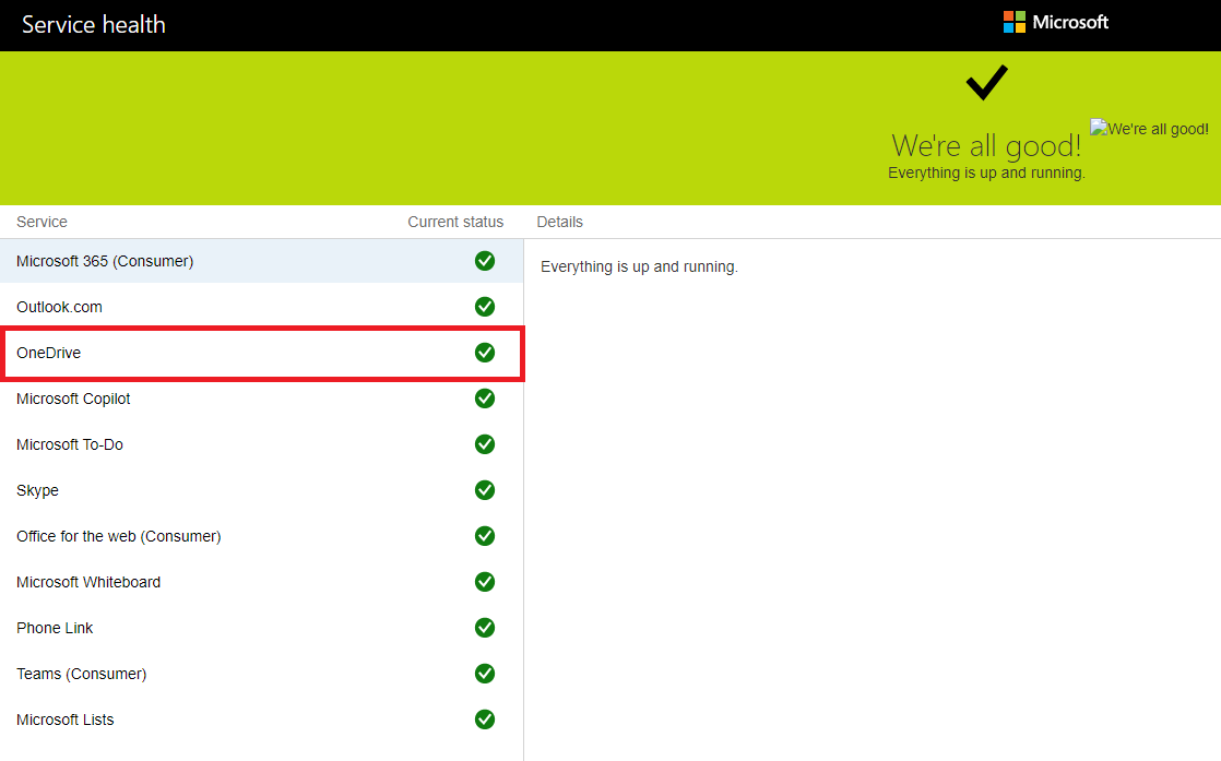 - To check whether the OneDrive servers are up and working normally, navigate to Microsoft’s service status webpage.