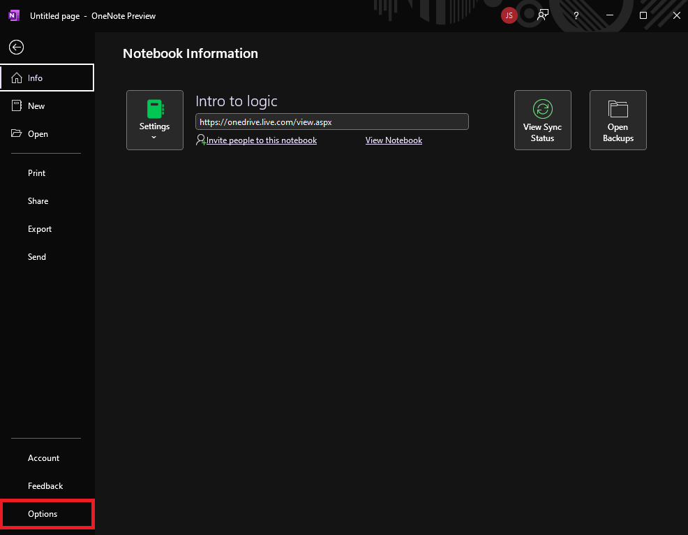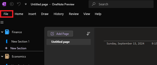 - In the OneNote application, navigate to the menu bar and select the File button.