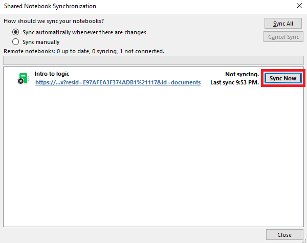 - In the synchronization window, click on the Sync Now button in front of the problematic notebook to perform a manual sync.