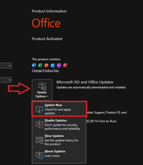 - In the Account section, click the Update Options button, then select Update Now from the drop-down menu to update the application to the latest version.