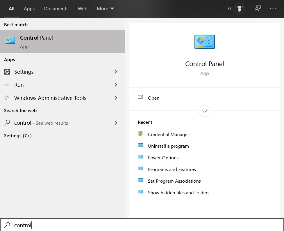 - Open the Control Panel by clicking your Start Button->Type Control and hit Enter.