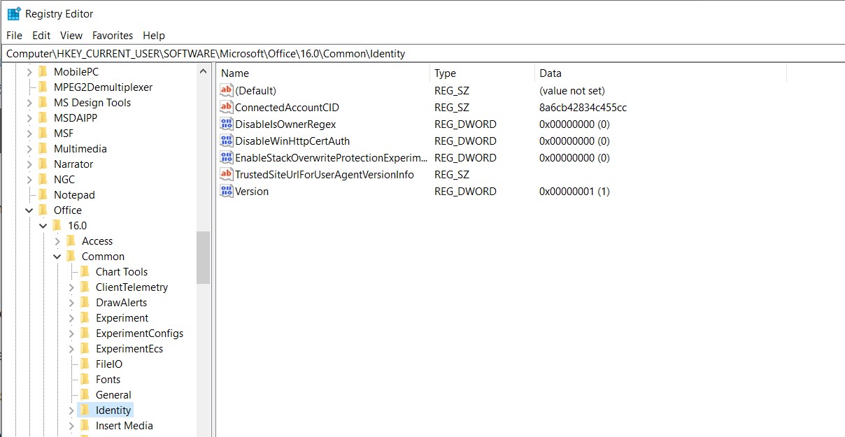 Expand Software - Now, expand Microsoft ->Office -> 16.0 ->Common -> Identity.