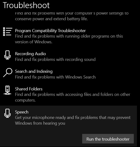 The first thing to do in issues like these is to rule out hardware failure. Running the built-in speech troubleshooter will tell you if there is a problem with your microphone or with its configuration settings. If there is, it will automatically attempt at fixing the problem and notify you accordingly.
