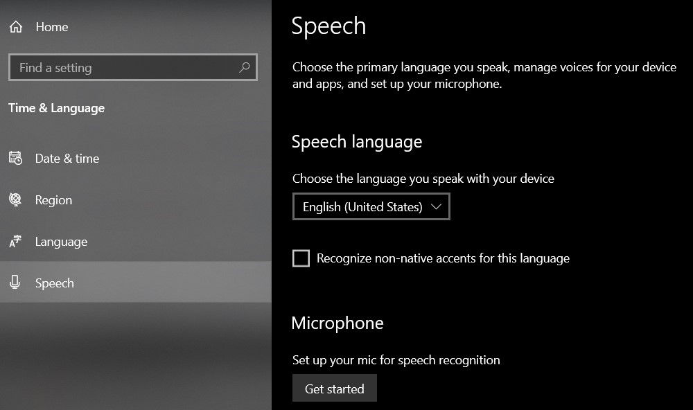 - First, check that your regional and speech language is selected. Click the Start button, then the gear-shaped icon and from Settings, click Time and Language.