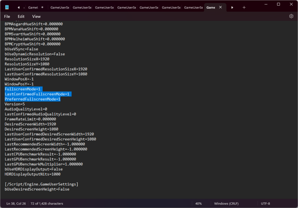 - Search for settings like FullscreenMode, LastConfirmedFullscreenMode, and PreferredFullscreenMode.