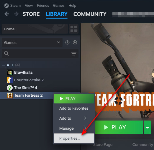 Note: Through this process, you can set other launch options. You can check other commands on Steam Support. - Click on Properties from the drop-down menu.