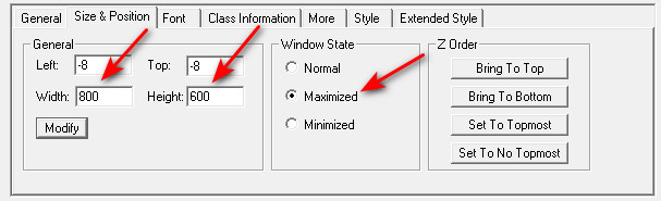 - Navigate to the Size & Position section. Here, input your desired height and width for the window. Then, choose either “Maximized” or “Normal” under Window State.