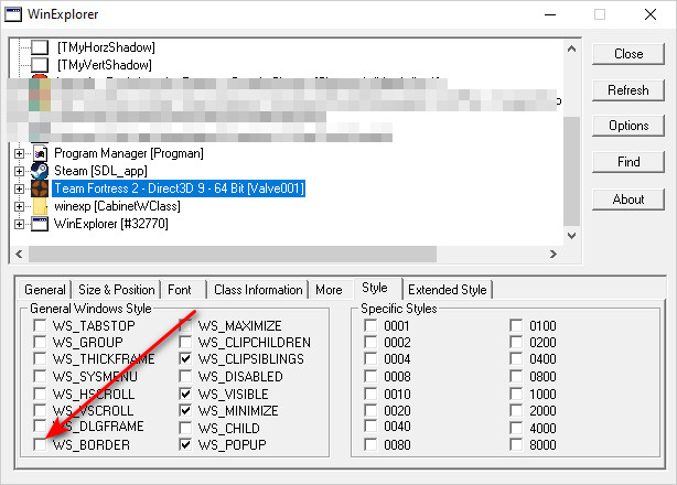 - In the Winexp interface, under the “Style” section, make sure the option WS_BORDER is unchecked (not selected).