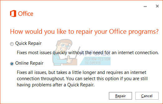 If it is Office 2013, 365, or 2016, then choose the Full Repair or Online Repair option. Wait for the repair to finish; it can take 30 to 50 minutes.
