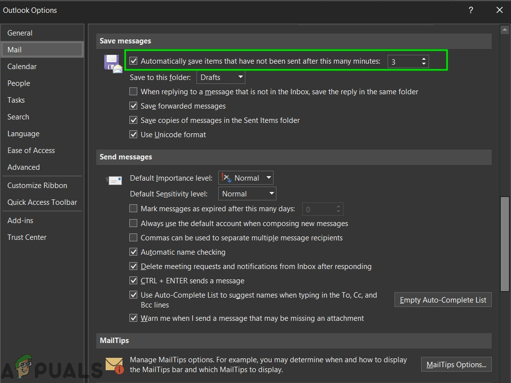 Uncheck AutoSave in Mail Options in Outlook - Now restart Outlook and check if Outlook has started to operate normally.
