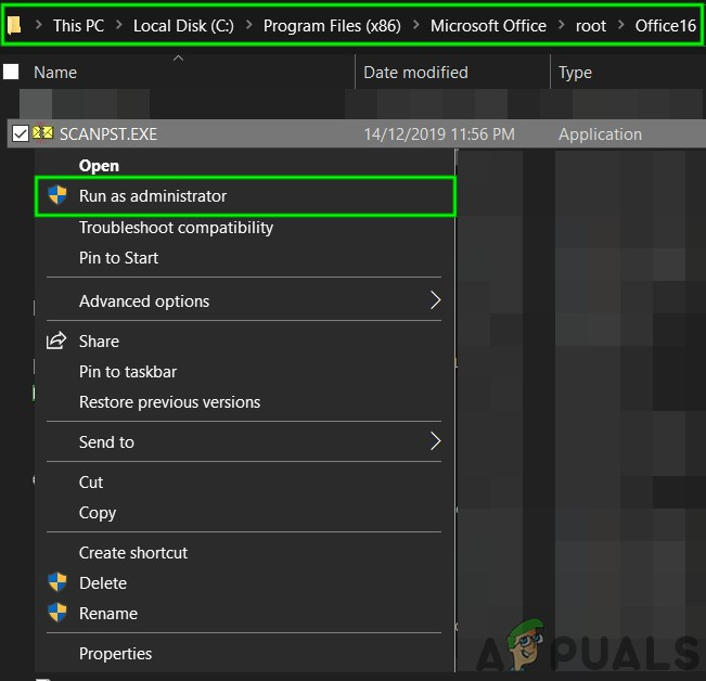 - Now in Office 16 folder, find SCANPST.EXE file and Right-click it and then click on “Run as Administrator”.