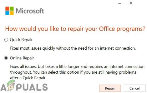If Microsoft Office/Outlook’s installation itself is corrupted, then it may cause problems when adding attachments to emails. Running the Microsoft Office built-in repair tool will clear any issues with the installation and thus may clear the problem.