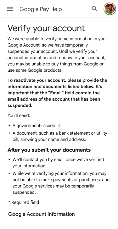 - Go to pay.google.com and check for any alerts or prompts. If you see nothing, visit this official verification form to start the verification process manually.