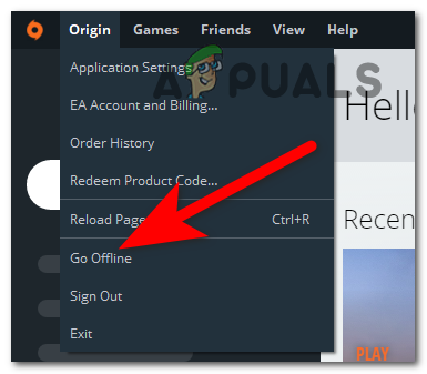 - Once you are inside the Origin launcher, click on the Origin button in the top left corner and click on Go offline.