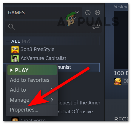 - After you’ve done that, search for the game you want to play through the list of all the games that you own and right-click on it, then click on Properties.