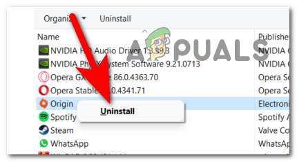 Uninstalling your Origin application from the Programs and Features - Follow the instructions to complete the process, then wait until the launcher is completely uninstalled.