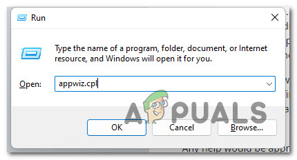 - Press Windows key + R to open up a Run dialog box. Inside the Run dialog box, type ‘appwiz.cpl’ and press Enter to open up the Programs and Features menu.
