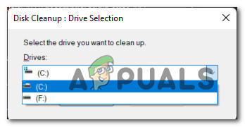 - At the first prompt of Disk Cleanup, select your Windows drive (the one with the windows logo) using the drop-down menu below.