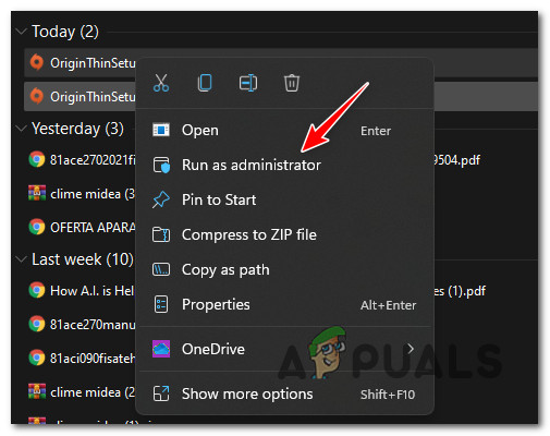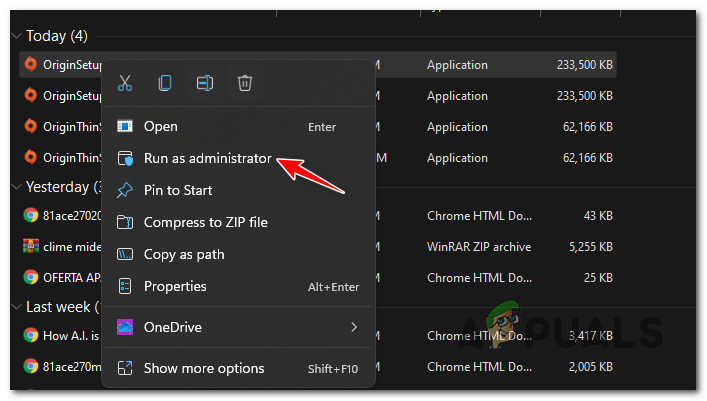 - Missing admin rights – Before you try any other fix features in this article, you should ensure that you’re opening the installer with admin rights. A few affected users have confirmed that once they forced admin access on the Origin installer they finally managed to complete the installation.