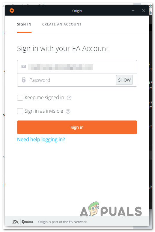 Sign out of Origin - Wait until the log-out procedure is complete, then use the Origin login screen that just appeared to reinsert the login credentials (email and password) before clicking on Sign in to log back into Origin.