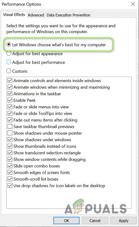 - Now click on the Settings button (in the Performance section) and in the Visual Effects tab, select Let Windows Decide What’s Best for My Computer and apply the changes.