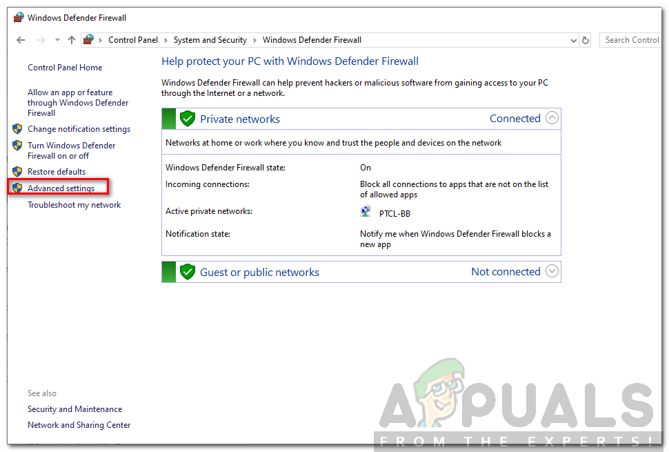 Adding Outlook to the list of excepted items - Save the changes, then follow step 1 again to open the firewall menu once again. But this time, click on Advanced Settings from the left-hand menu.