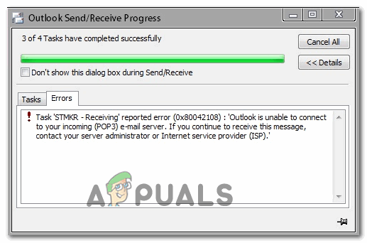 The Error 0x80042108 (Outlook is unable to connect to your incoming POP3 email server) appears for Windows users after Outlook fails to send any type of email. Most affected users have confirmed that they receive email normally.