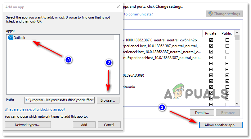 Adding Outlook to the list of items Note: In case Outlook is not on this list, click on Allow another app, navigate to the location of the Outlook executable and double-click on it to add it to the list.