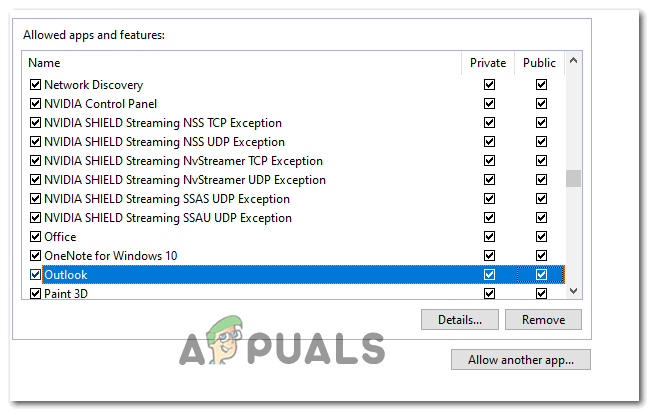 Changing the Settings of the Allowed Items in Windows Firewall - Once this list becomes editable, scroll down through the list of items and locate the entry associated with Outlook. When you see it, ensure that bot boxed (Private and Public) are checked before clicking Ok to save the changes.