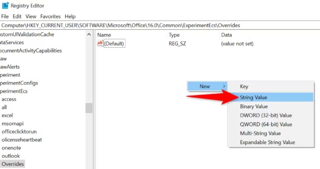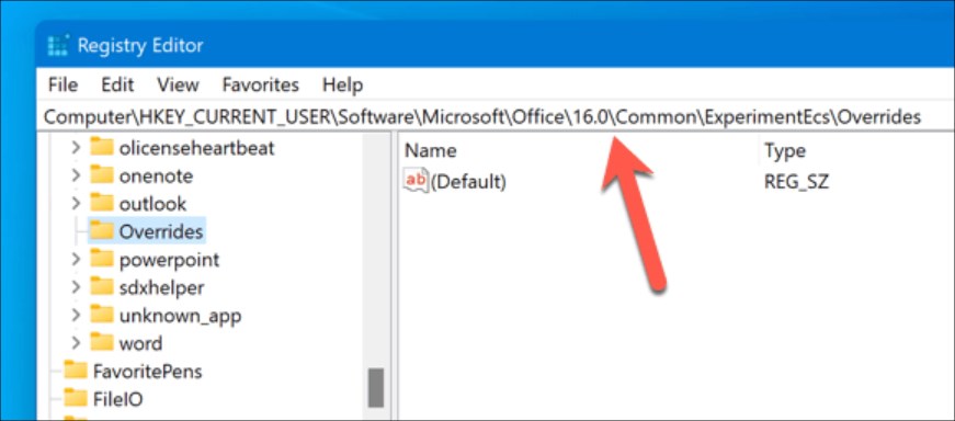 - In the Registry Editor window, navigate to: HKEY_CURRENT_USER\SOFTWARE\Microsoft\Office\16.0\Common\ExperimentEcs\Overrides