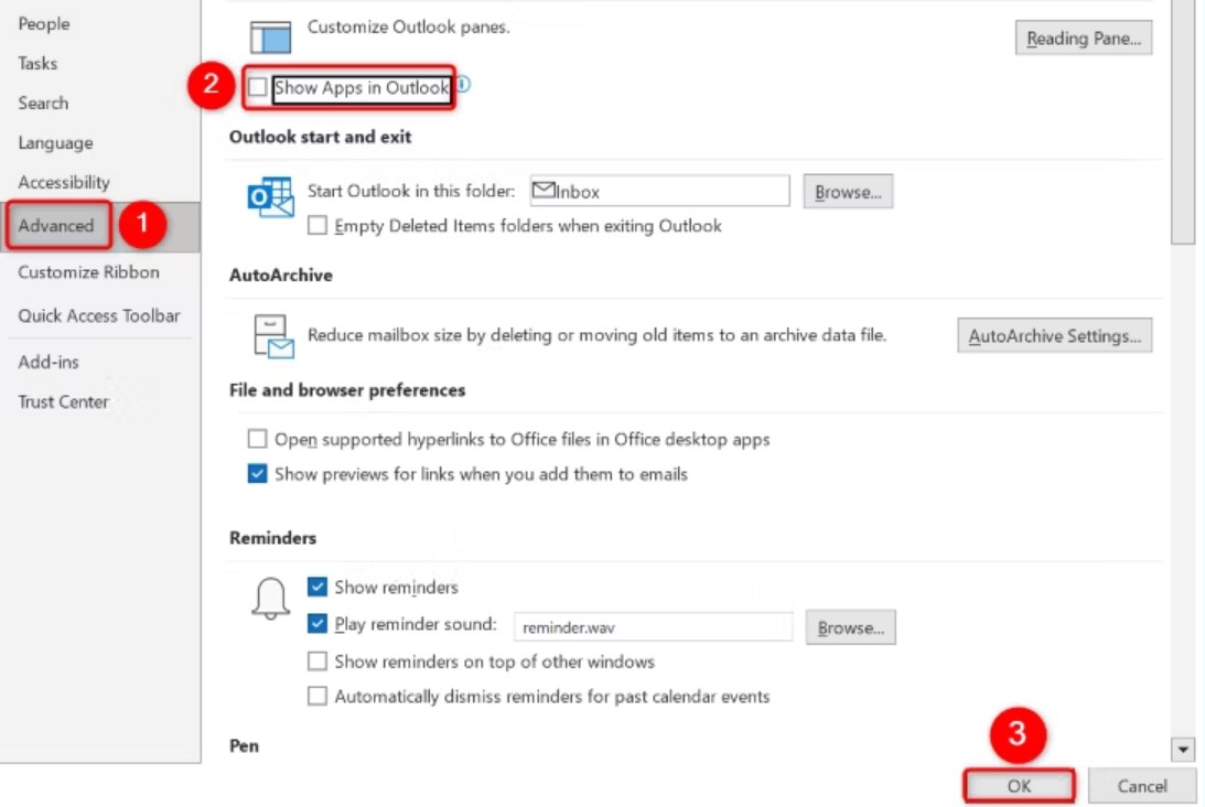 - Turn off the “Show Apps in Outlook” option in the right pane.