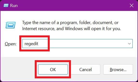 - Press the Windows key and R simultaneously to open the Run dialog box. Type “regedit” and click OK.