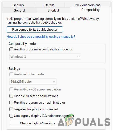 - In the following dialog, head over to the Compatibility tab and if any box there are checkmarked, unchecked them.