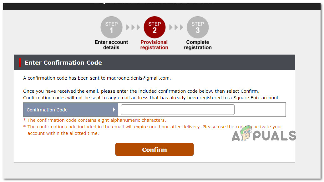 - After you hit the Next button, Square Enix will send you a confirmation code on the email box that you previously used as validation. Access your inbox, retrieve the code and paste it inside the Confirmation Code before clicking on Confirm to validate your account.