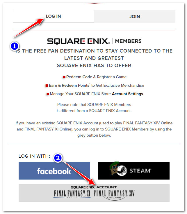 Sign in with the Square Enix account - Next, make your way to membership.square-enix, click on the login tab at the top, then click on Square Enix account from the list of available options.