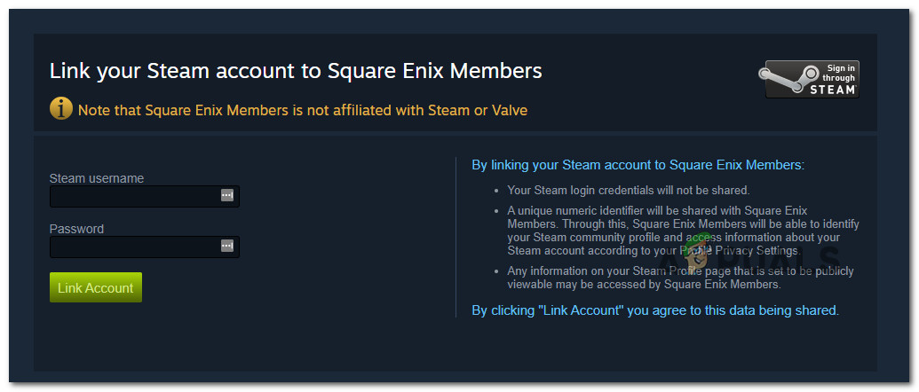 If you’re attempting to play the game on PC after getting it via Steam (and you previously confirmed that there isn’t an ongoing server issue affecting other users), the problem is most likely occurring because you’re using a Steam account that is not synced with Square Enix.