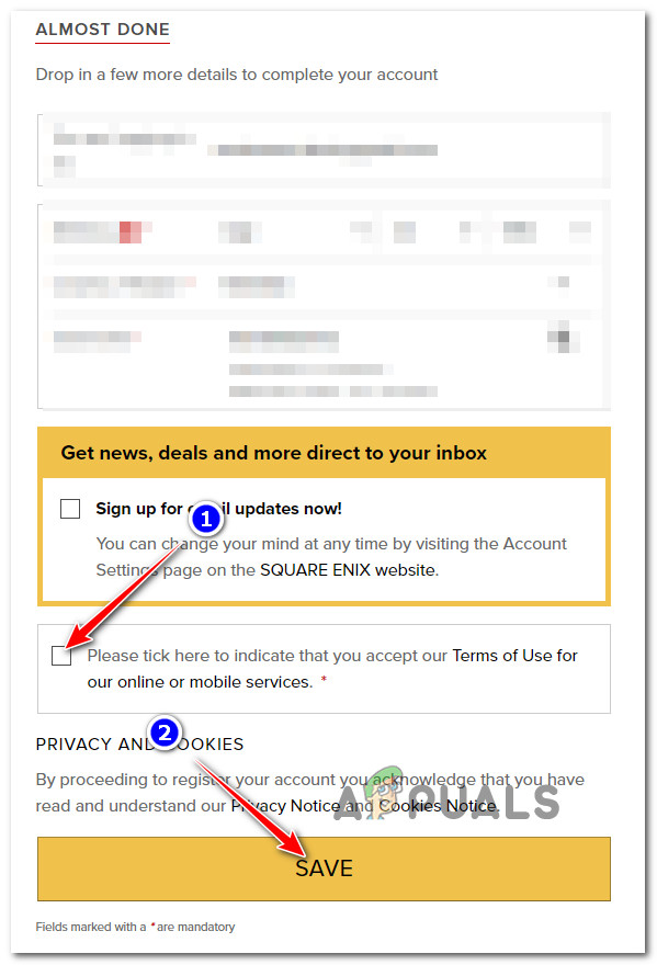 Creating a new Square Enix account Note: Keep in mind that before creating your Square Enix account, you need to agree with the TOU (Terms of Use) and with the Privacy Policy by checking the appropriate boxes before clicking Next.
