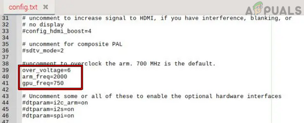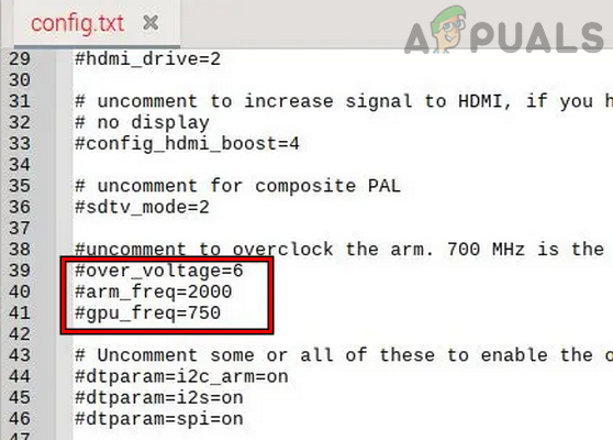 2. Now head to the section where the values were added/edited earlier and simply add a # sign (which will disable the execution of these commands by marking them as comments) before each entry i.e., add # before over_voltage, arm_freq, and gpu_freq.