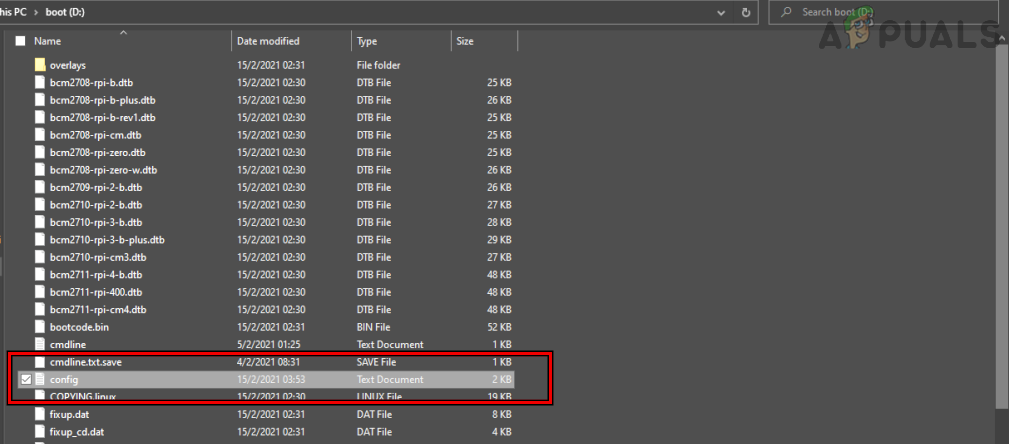 3. Then, in the Boot partition of the SD card, find the config file and open it with the Notepad or Notepad++ (it is better to use Notepad++ as notepad can corrupt Linux distro files and the changed configurations may not be applied).