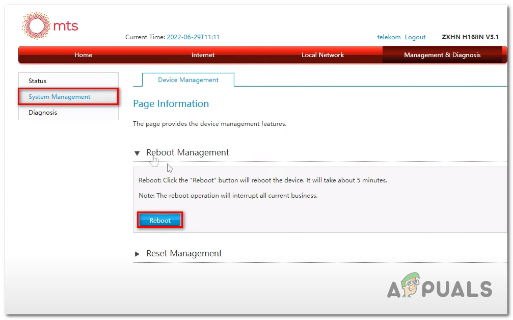 Rebooting Router - On the left panel Click on system management and Click on Reboot.