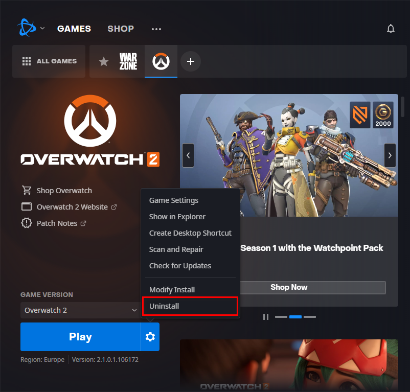 Uninstalling Overwatch 2
